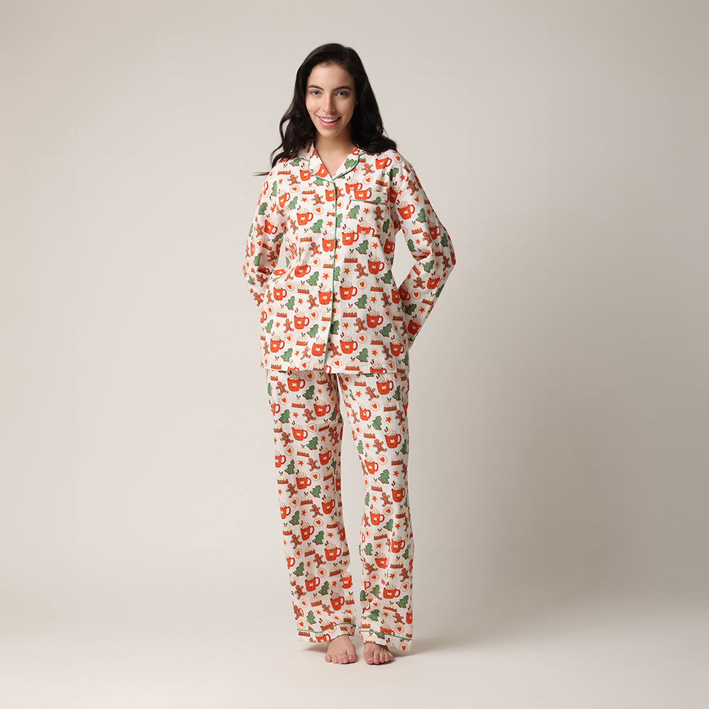 This festive print is a holiday hug! Gingerbread buddies, cocoa mugs, Christmas trees, stars, and sweet treats dance all over in cozy, merry cheer.