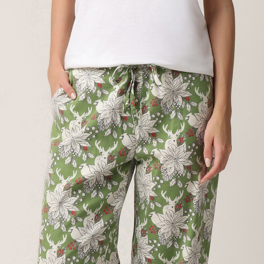 This print is pure holiday woodland magic! With graceful deer, snowy poinsettias, red berries, and cozy green vibes, it's like a winter fairytale on fabric.