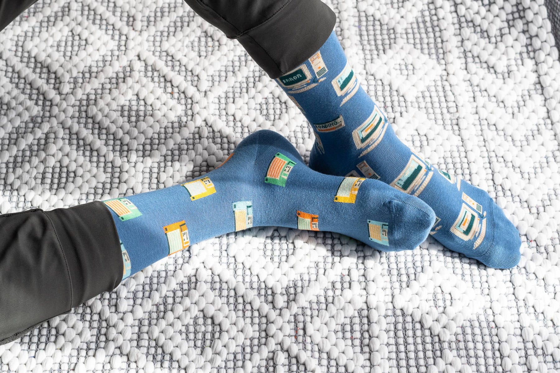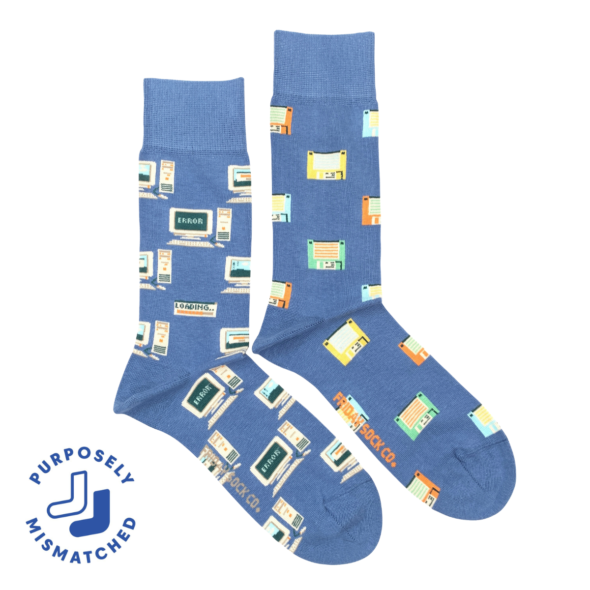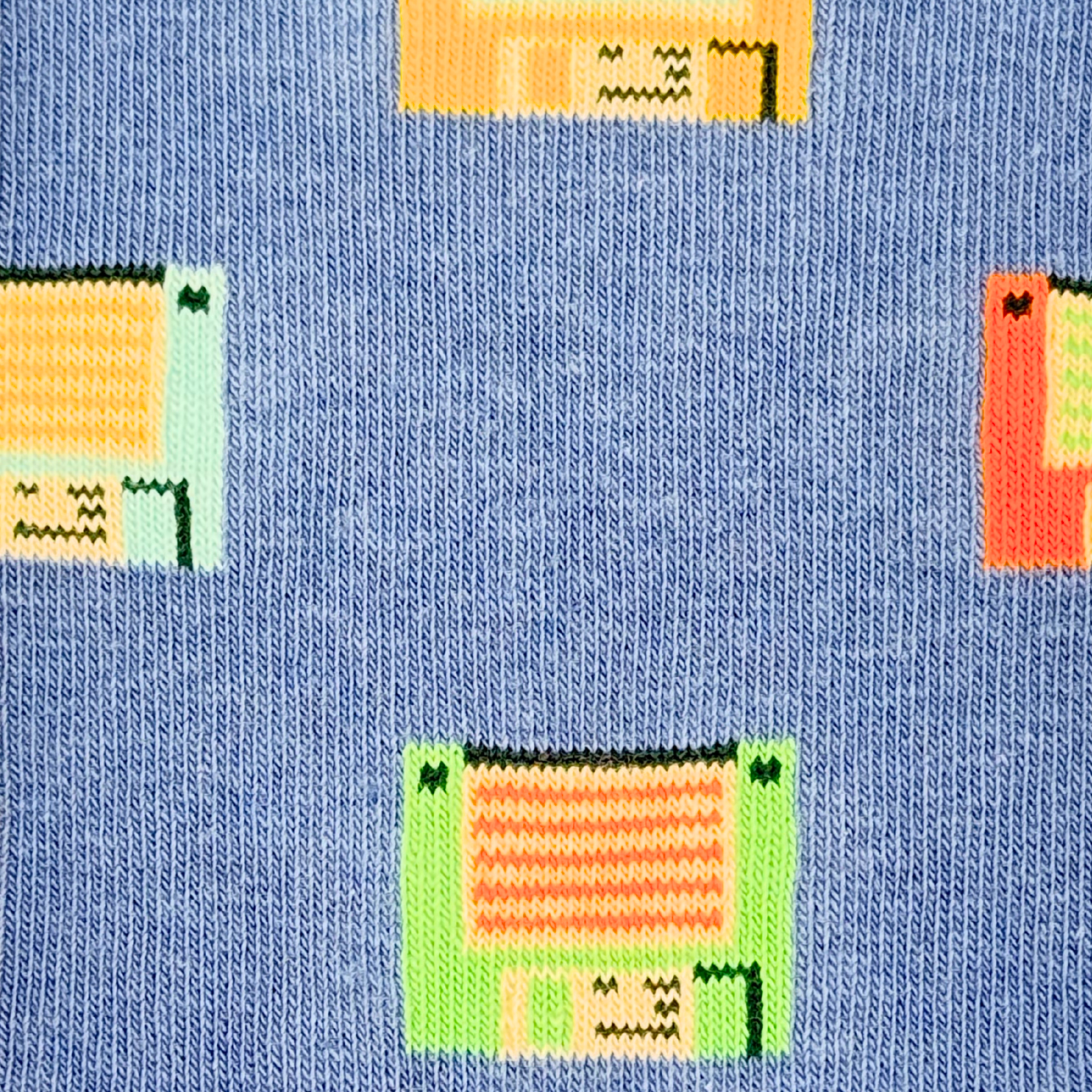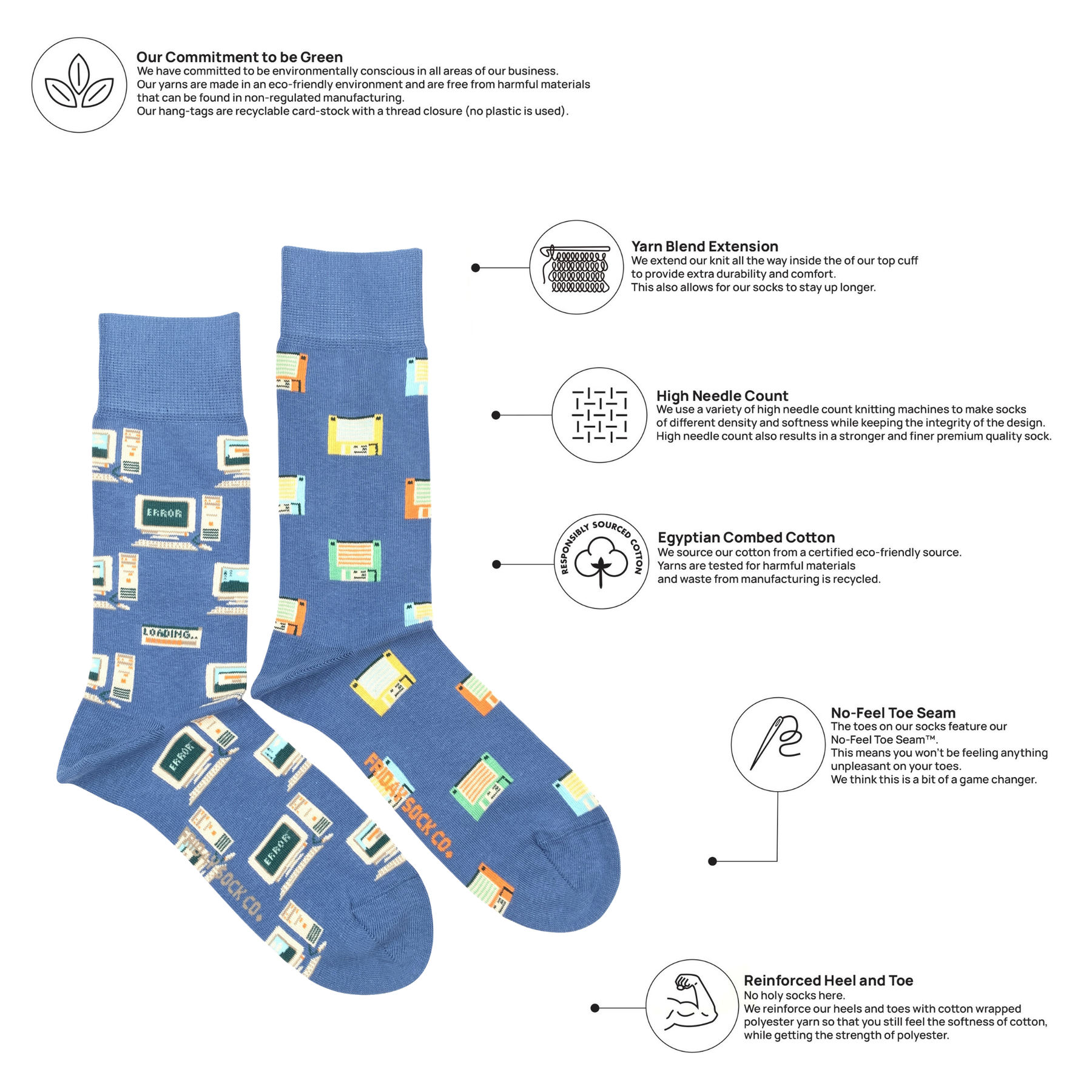 Byte into retro style with this uniquely tech-inspired pair, evoking the clunky charm of old computers and the satisfying click of a 3.5-inch floppy. Designed in Canada, ethically made in Italy. 85% Egyptian Combed Cotton 12% Nylon 3% Spandex Expertly sewn Rosso Toe Link Yarn blend extending throughout the top cuff for extra durability and comfort Reinforced Heel & Toe Produced using eco-friendly certified Egyptian Combed Cotton* *The yarn used in our socks undergoes a comprehensive, third-party testing and certification system for textile products at all stages of production. Test criteria are updated annually and go far beyond existing legal regulations.