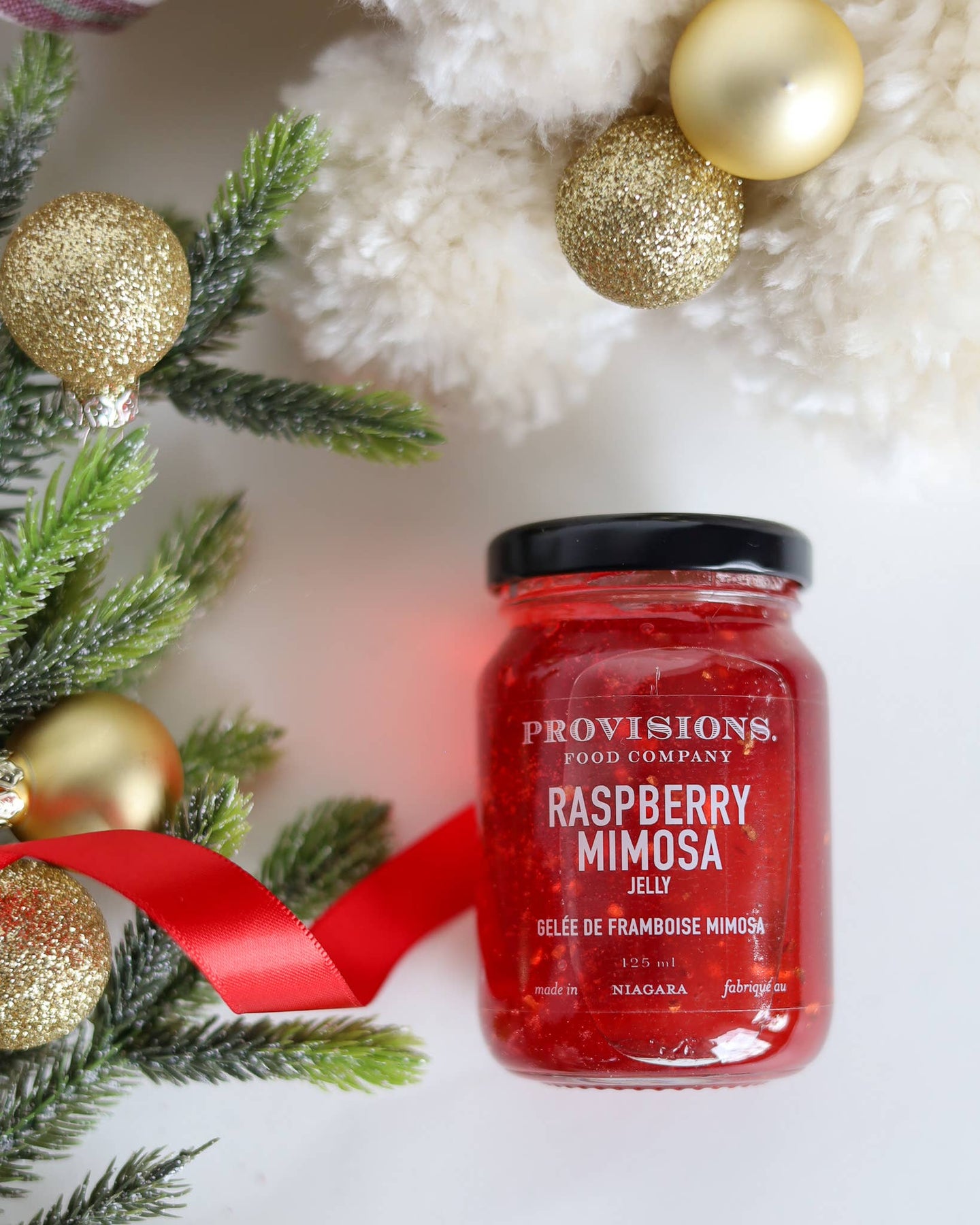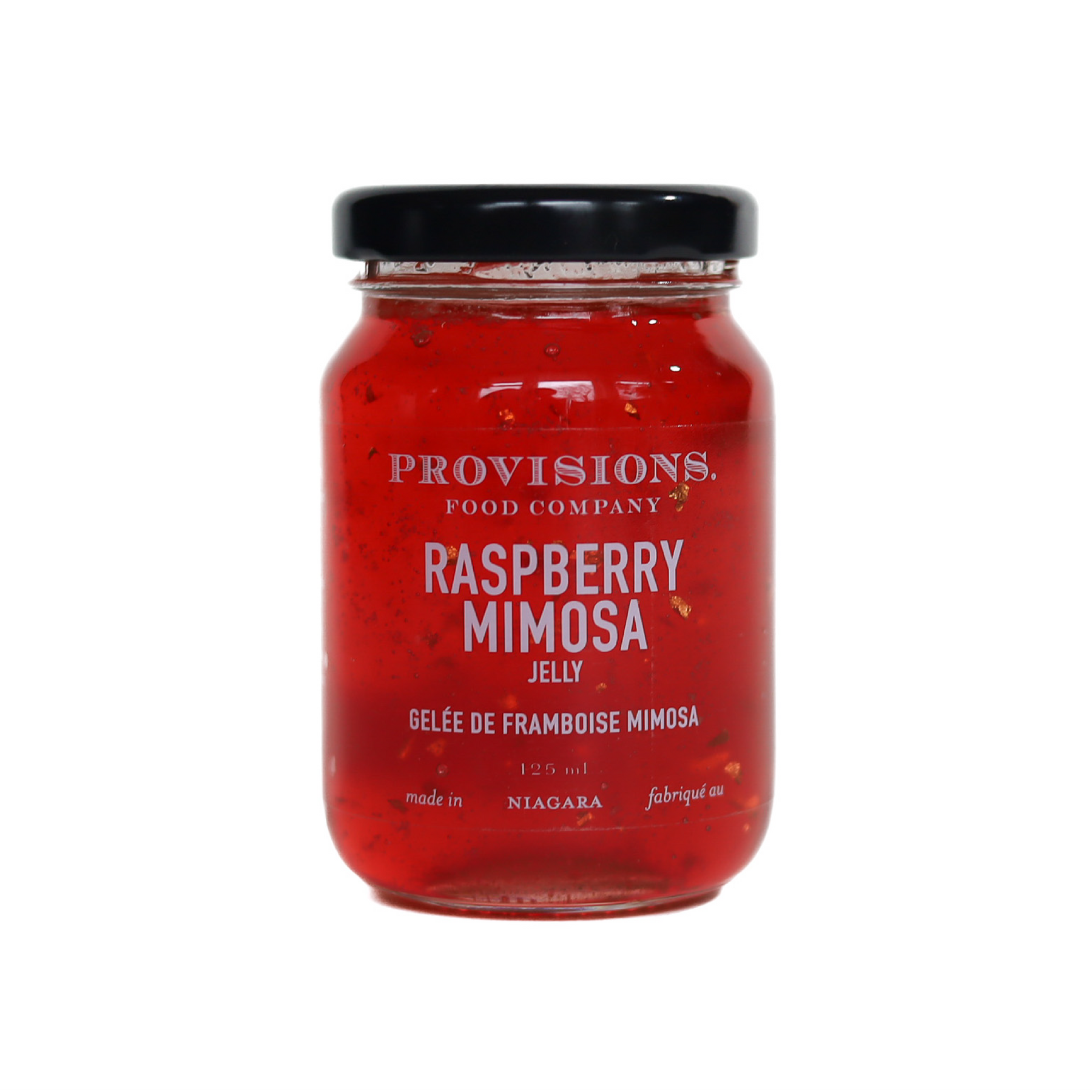 Our limited edition Raspberry Mimosa Jelly blends raspberry juice, hints of Prosecco, with shimmering gold flakes. A luxurious addition to elevate any occasion. INGREDIENTS: Sugars (cane sugar, concentrated raspberry juice), Water, Prosecco, Pectin, Gold leaf, Natural flavour. CONTAINS: Sulphites. • Made by hand in small batches in Beamsville, Ontario. • Preservative-free. • Vegan and gluten-free. • Shelf life of 2 years. • 125mL recyclable glass jars. • Refrigerate after opening.