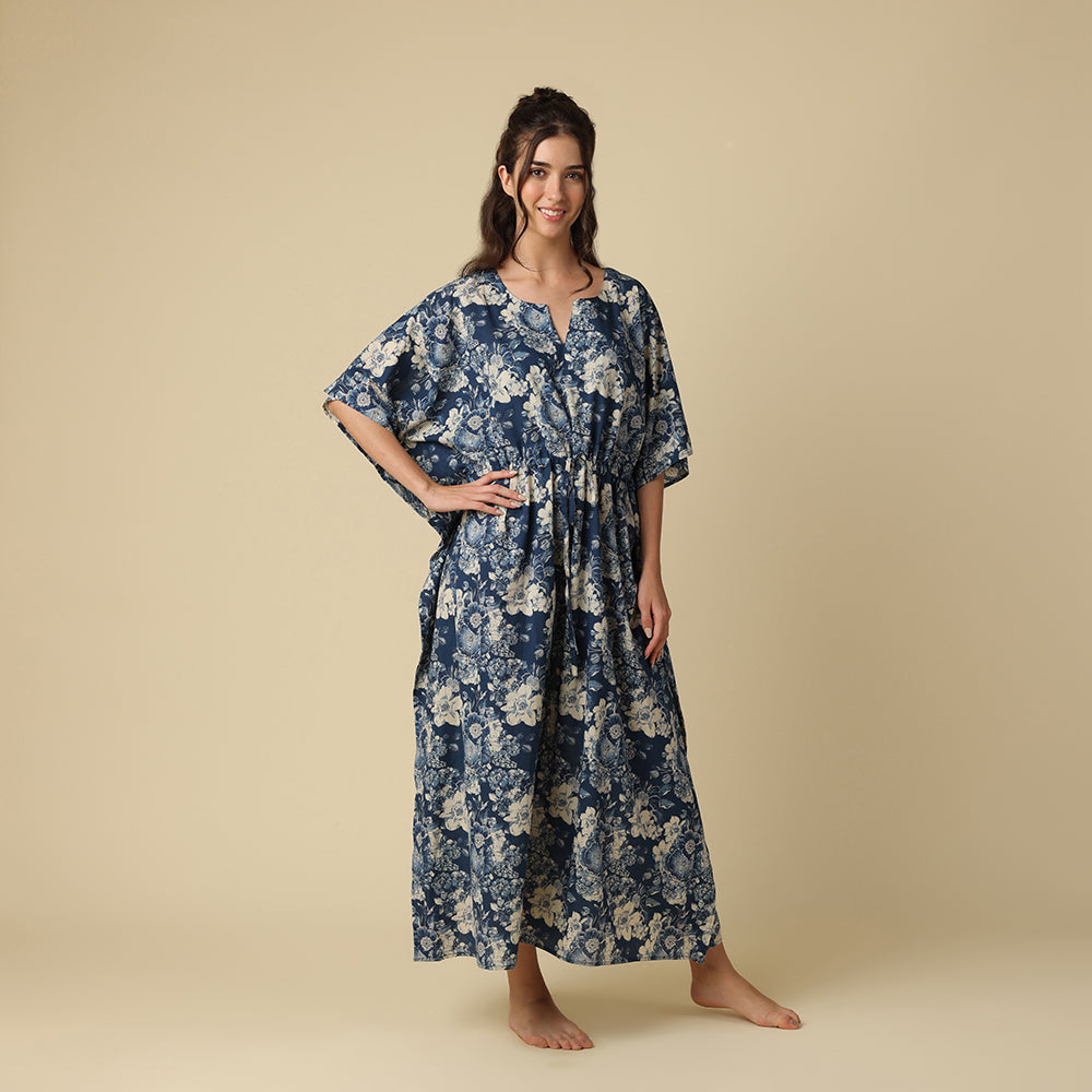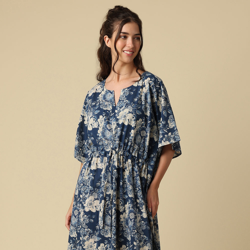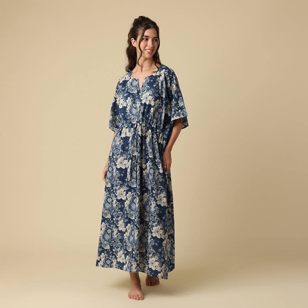 A flirty bouquet of indigo and ivory blooms twirls across a deep navy backdrop—like a midnight garden throwing a secret party under the stars!