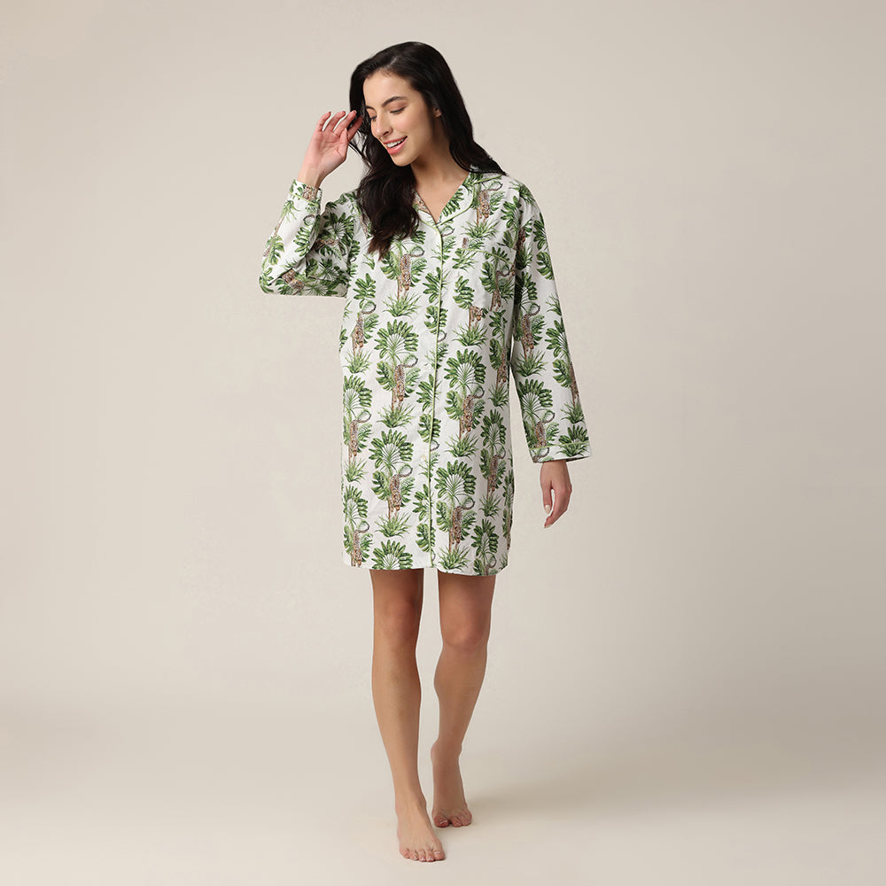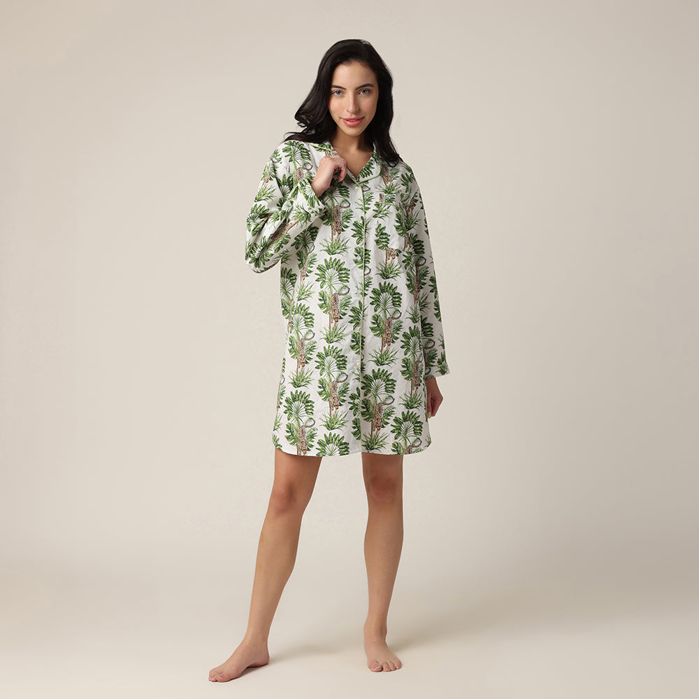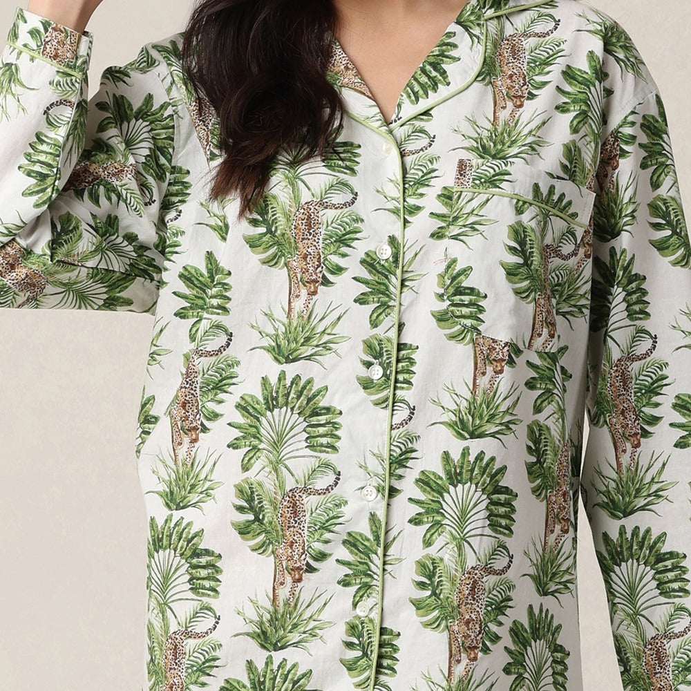 This playful print brings jungle vibes to life with curious leopards peeking through lush green palms—wild, fun, and full of adventure!