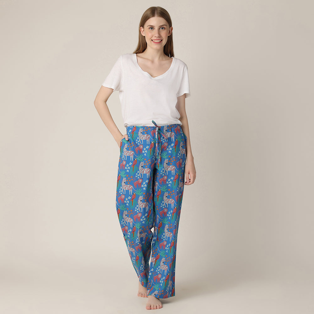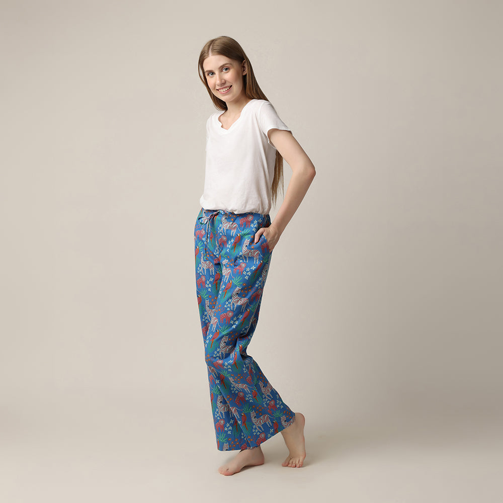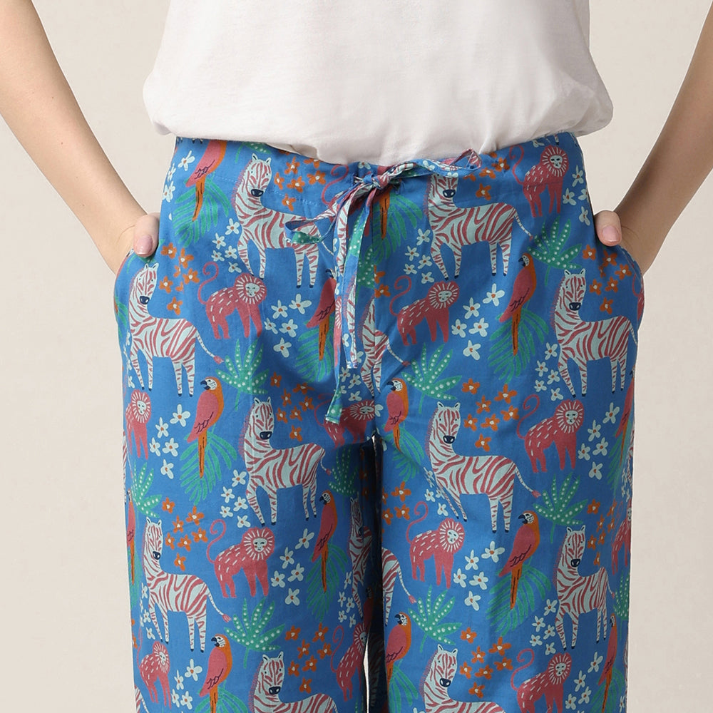 This print is a jungle jam! Stripy zebras, happy lions, and bright parrots party among colorful blooms on a bold blue background—wild fun all around!