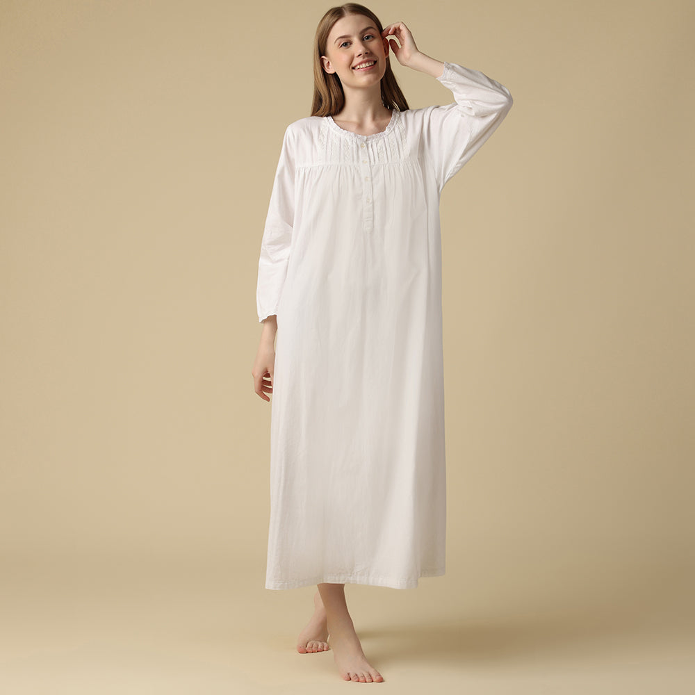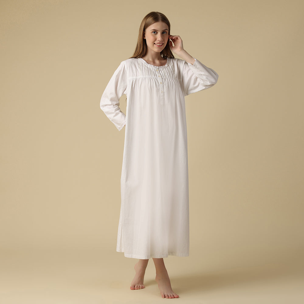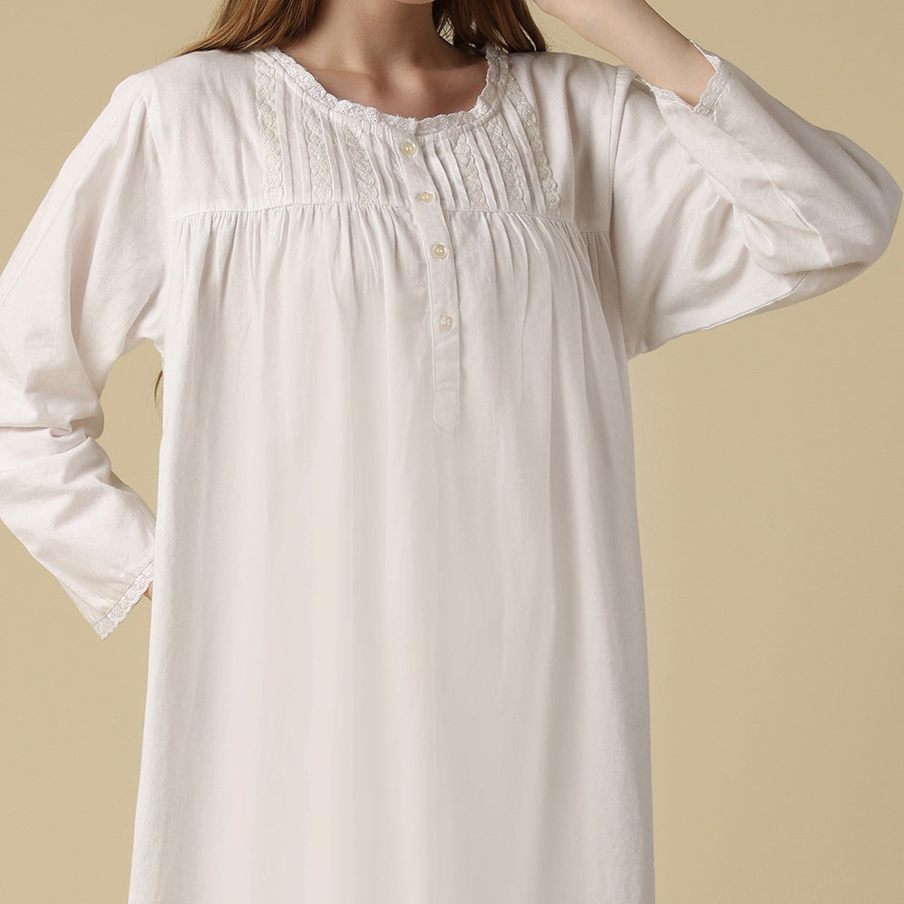 This Victorian-inspired nightgown is made from soft double-brushed cotton, offering a cozy and breathable feel. The design features a long, flowing silhouette with full-length sleeves, delicate pintucks, and subtle lace detailing along the yoke for a timeless, romantic touch. Its pure white color and buttoned neckline add to the vintage charm, while the addition of discreet side seam pockets brings a touch of modern practicality—perfect for keeping small essentials close while lounging or unwinding.