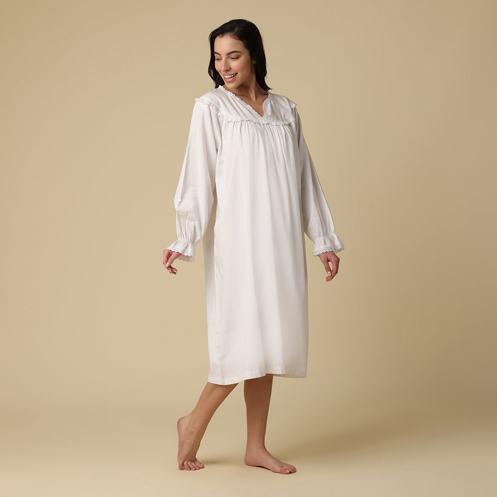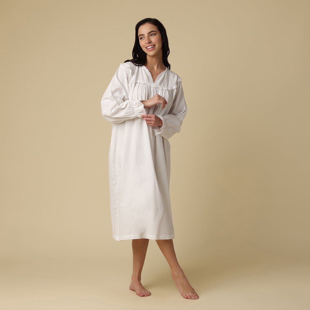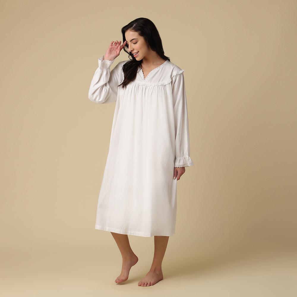 This classic nightgown is made from soft double-brushed cotton for ultimate comfort and warmth. It features a relaxed mid-calf silhouette, long sleeves with gathered cuffs, and a gentle V-neckline trimmed with delicate lace. The subtle gathers below the yoke enhance its vintage charm, while hidden side seam pockets add modern-day practicality—perfect for lounging with ease and grace.