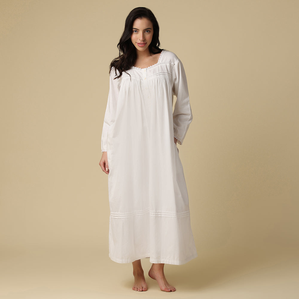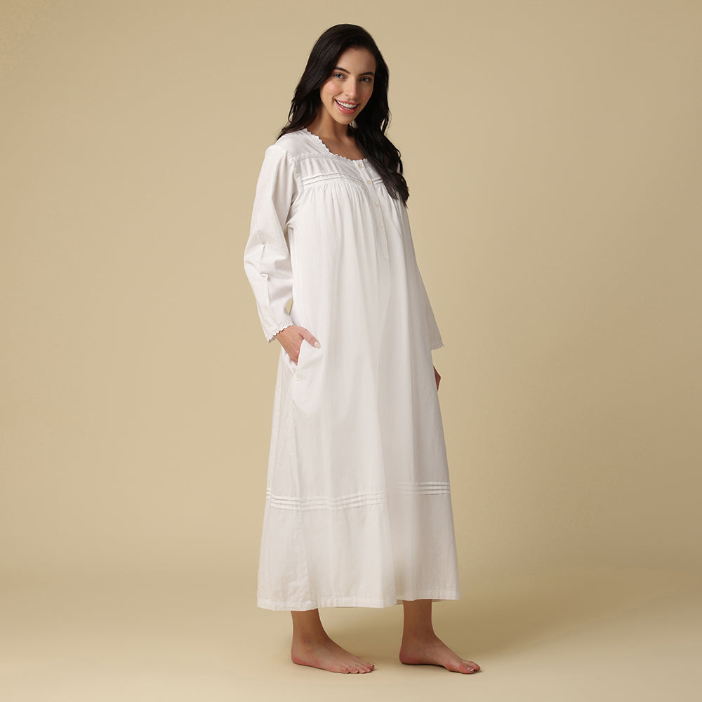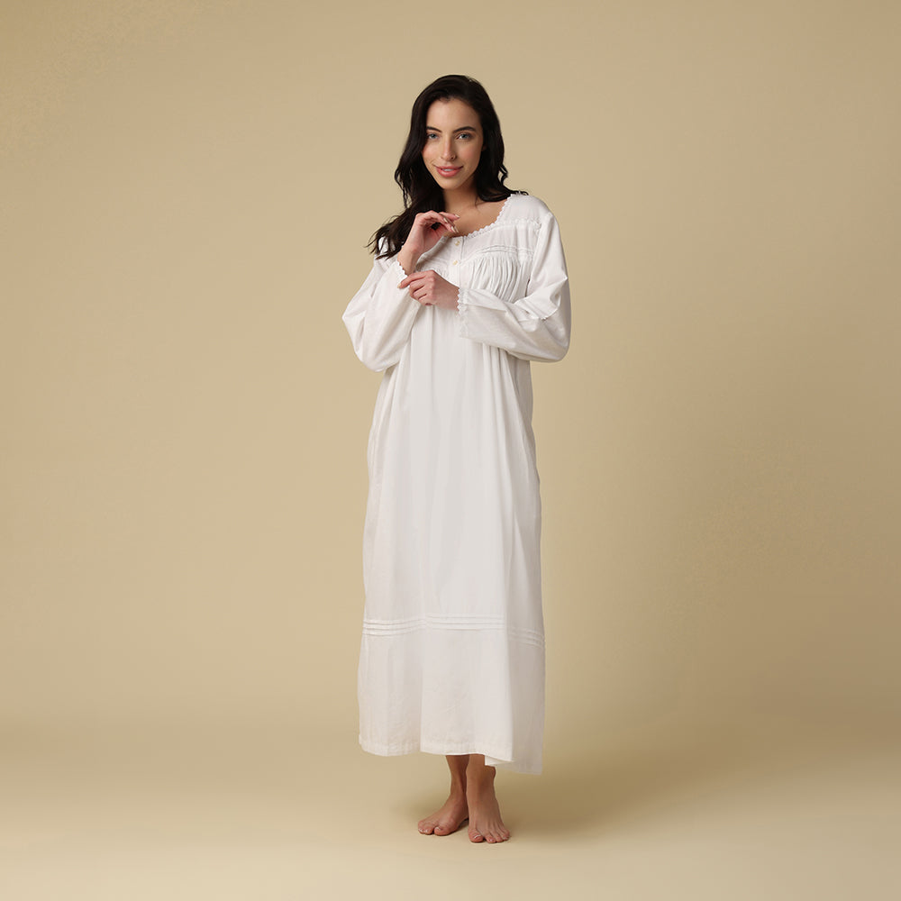 This vintage-inspired nightgown is crafted from ultra-soft double-brushed cotton, offering a warm and gentle touch against the skin. The full-length silhouette and long sleeves create a cozy, timeless feel, while delicate pintuck pleats and lace accents at the neckline nod to classic Victorian charm. Thoughtfully designed with hidden side seam pockets, it combines romantic elegance with everyday functionality—perfect for unwinding in comfort and style.